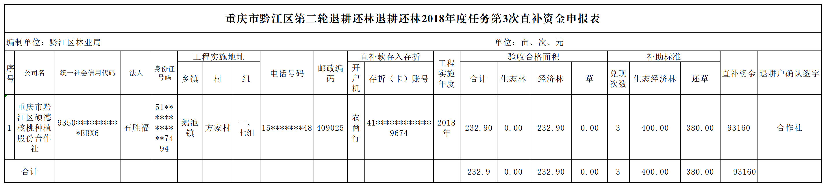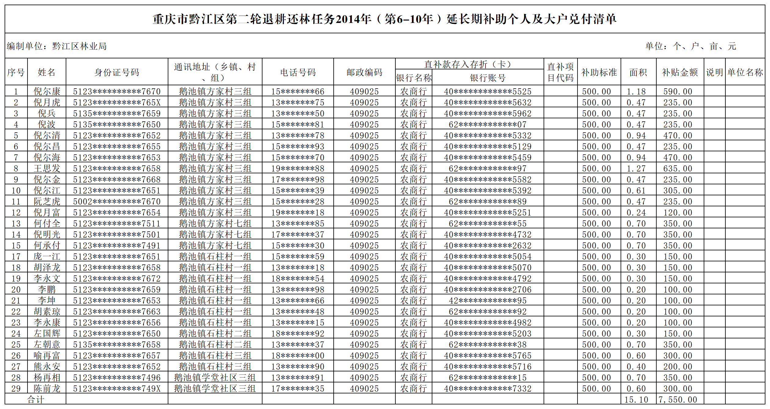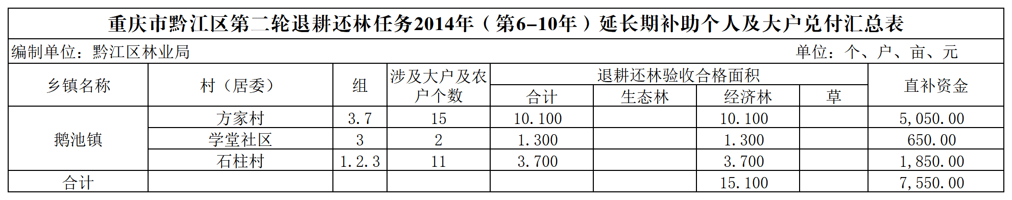 重庆市黔江区林业局2026年第二轮退耕还林2月补助资金兑付情况公示(鹅池镇)