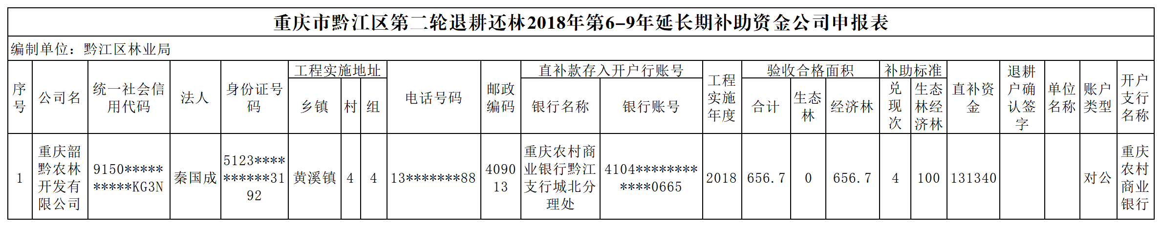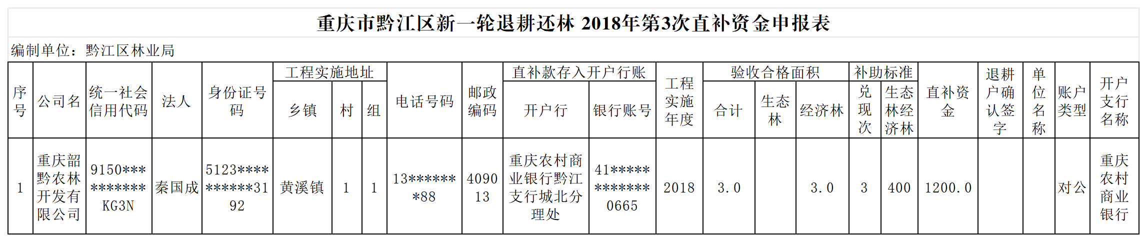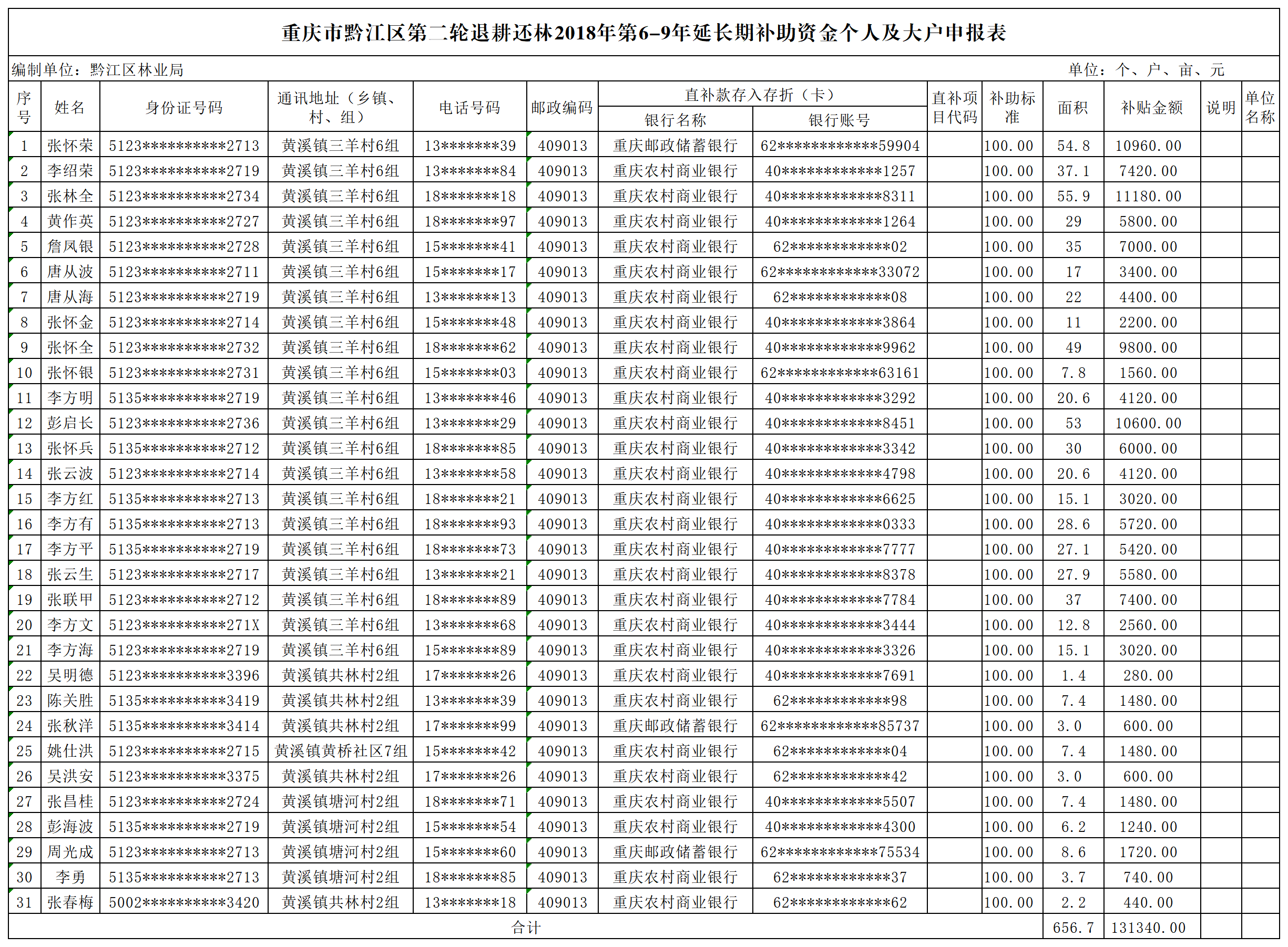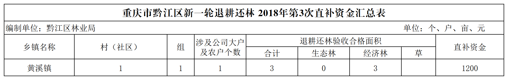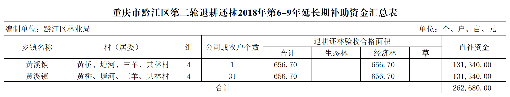 重庆市黔江区林业局2026年第二轮退耕还林2月补助资金兑付情况公示(黄溪镇)