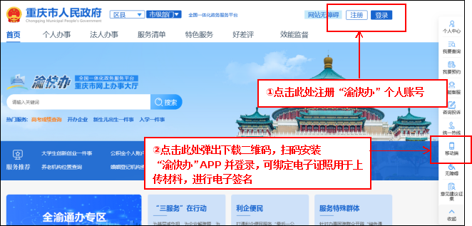 (一)注册重庆市政府“愉快办”政府服务平台并登陆,下载渝快办手机APP登录(上传材料过程中需使用手机APP电子签名)。