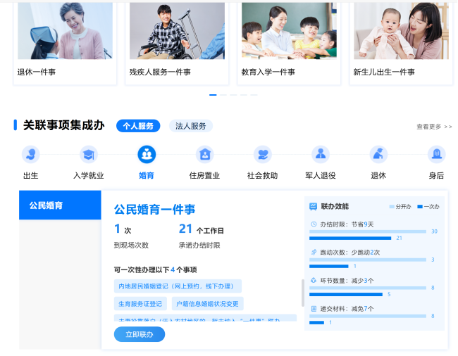 (三)进入“高效办成一件事”页面,选择关联事项集成办-个人服务-婚育-公民婚育一件事-立即联办。