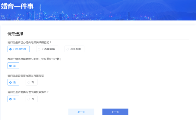 申办群众需完成婚姻登记(结婚登记和离婚登记以后)选择后任意一至三项所需办理事项进行组合申请。