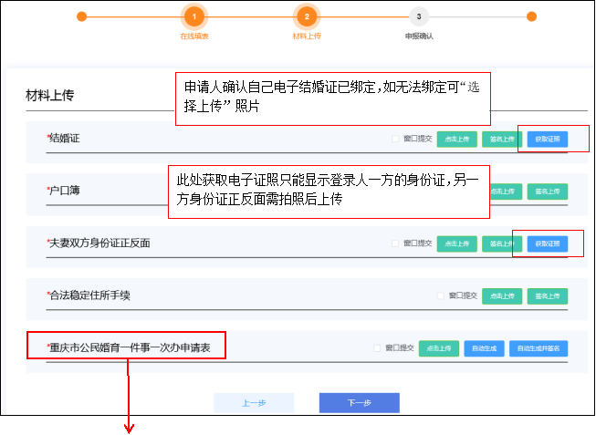 《重庆市公民婚育一件事一次办申请表》的上传有2种方式:需打印表格手动签字后上传照片;使用“渝快办APP(即重庆市政府APP)”扫码电子签名,免上传提交。