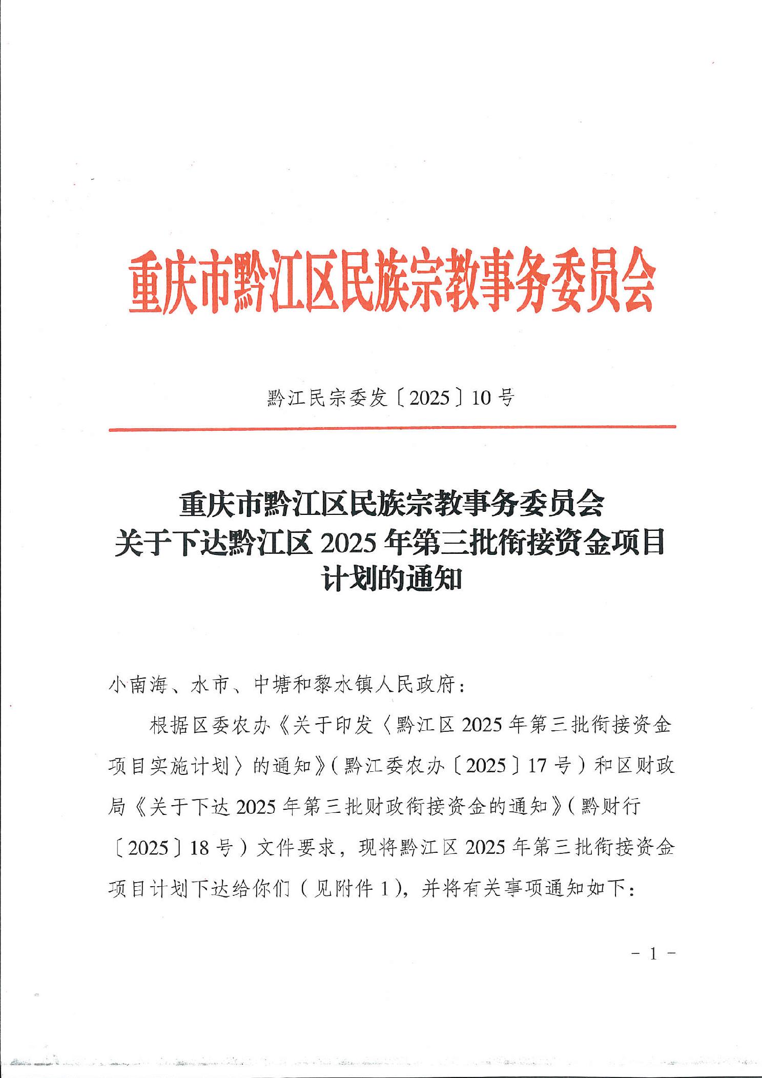 重庆市黔江区民族宗教事务委员会关于下达黔江区2025年第三批衔接资金项目计划的通知(黔江民宗委发〔2025〕10号).pdf