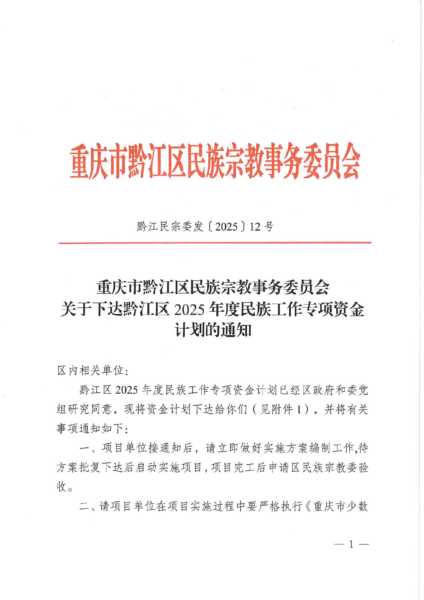 重庆市黔江区民族宗教事务委员会关于下达黔江区2025年度民族工作专项资金计划的通知(黔江民宗委发〔2025〕12号).pdf