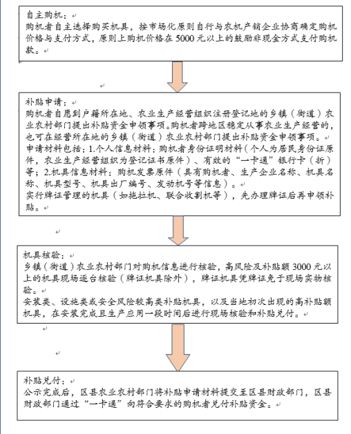 农机购置与应用补贴政策实行“自主购机、定额补贴、先购后补,区县结算、直补到卡(户)”。