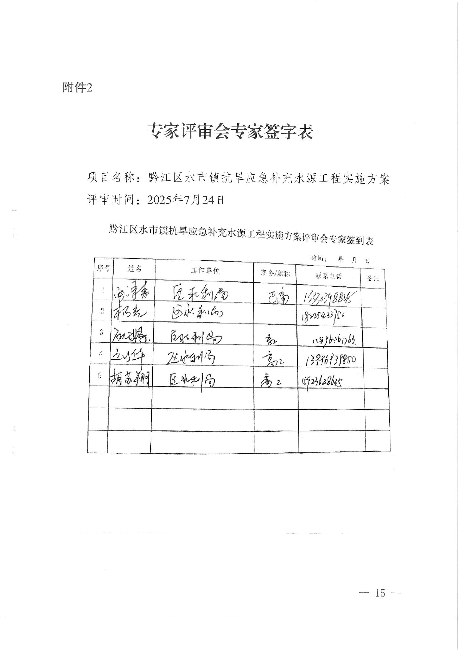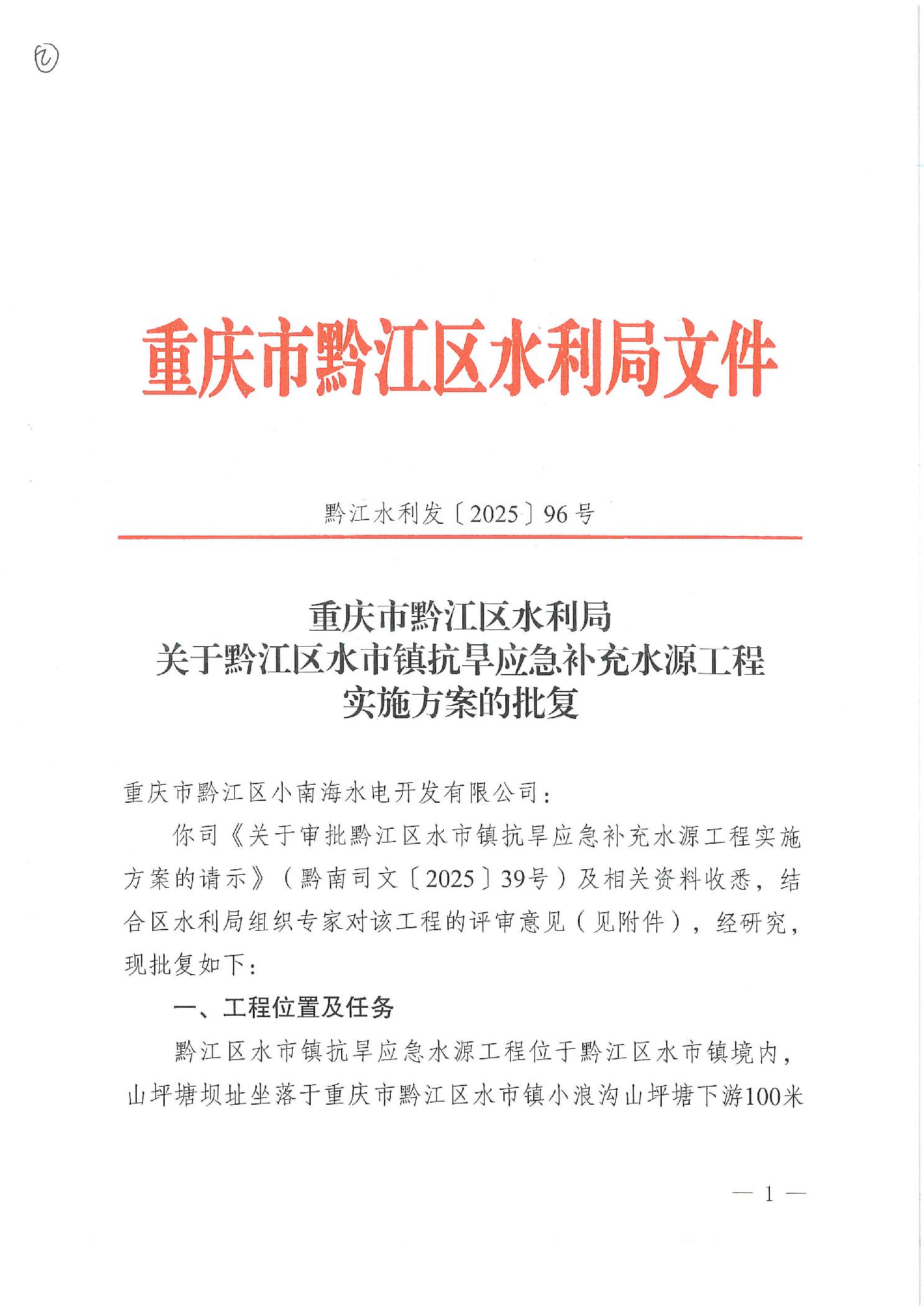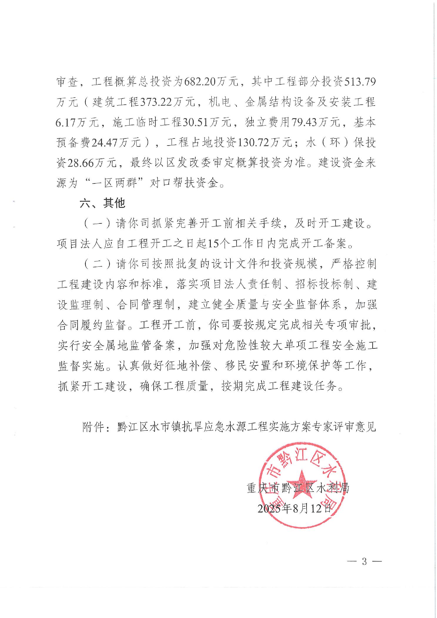 关于黔江区水市镇抗旱应急补充水源工程实施方案的批复