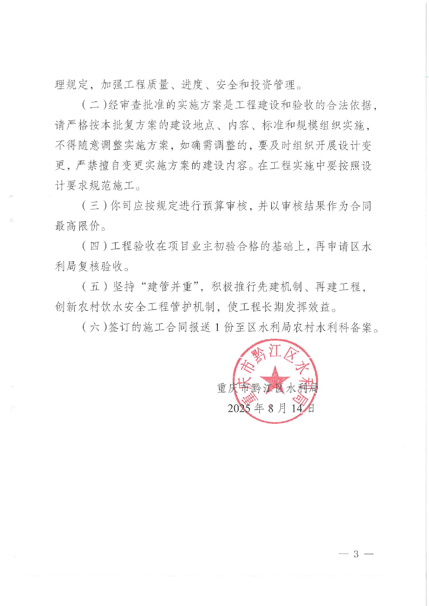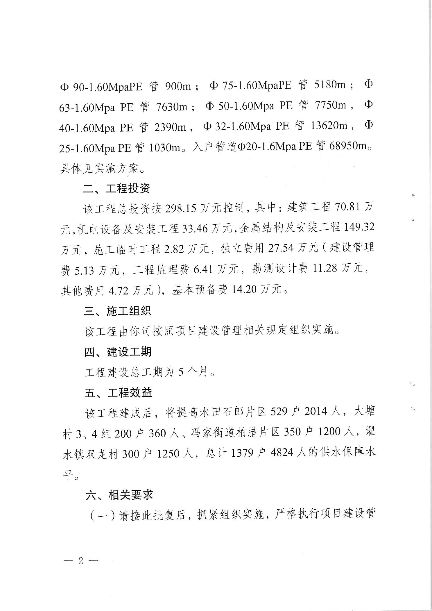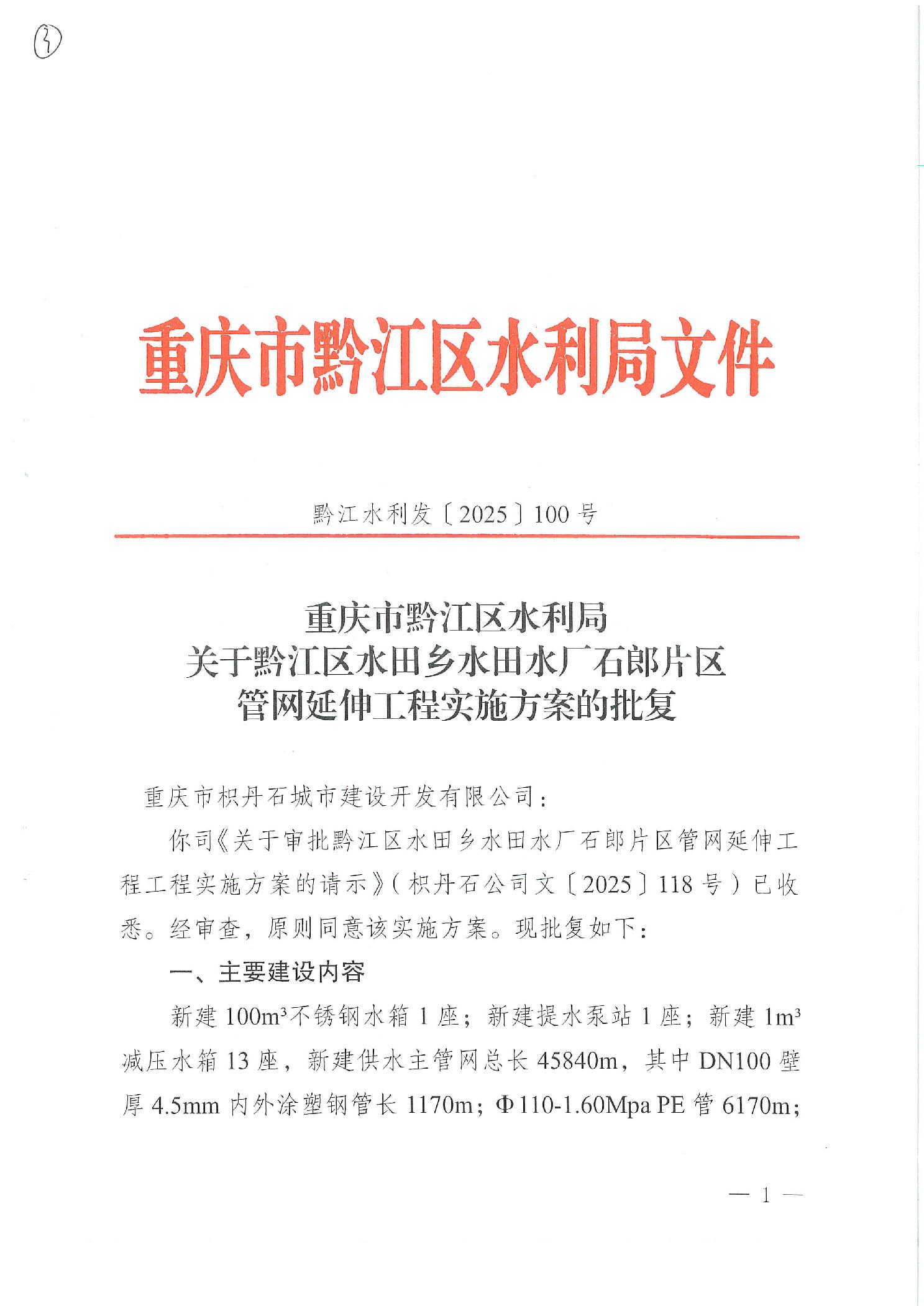 关于黔江区水田乡水田水厂石郎片区管网延伸工程实施方案的批复