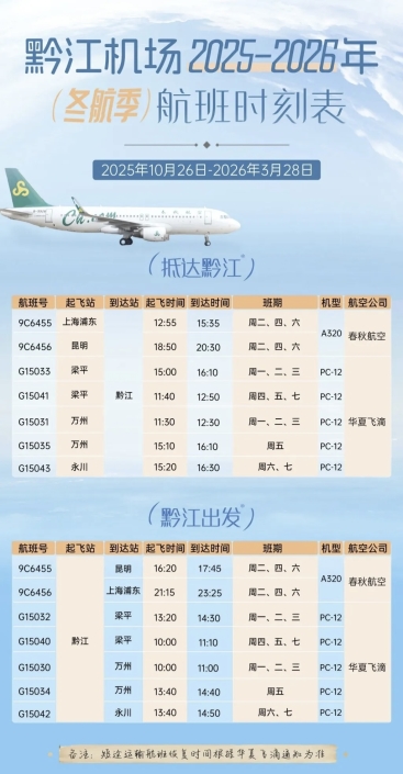 黔江武陵山机场2025—2026年(冬航季)航班时刻表(2025年10月26日—2026年3月28日)
