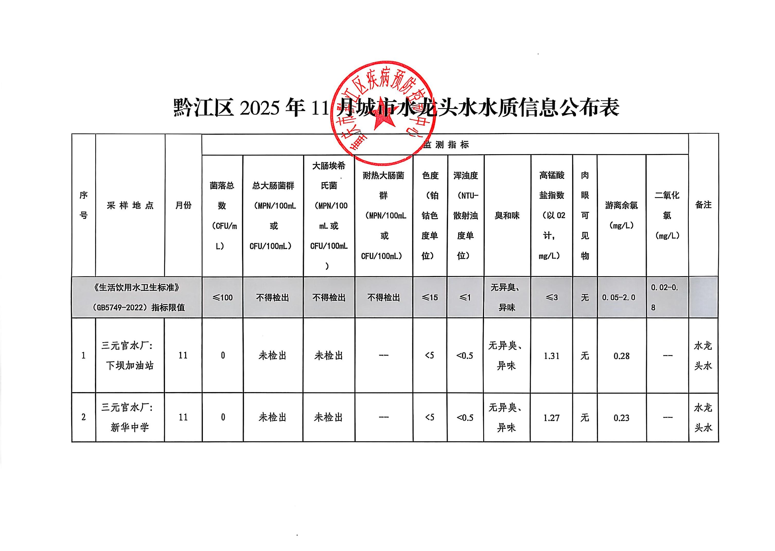 黔江区2025年11月城市水龙头水水质信息公示表
