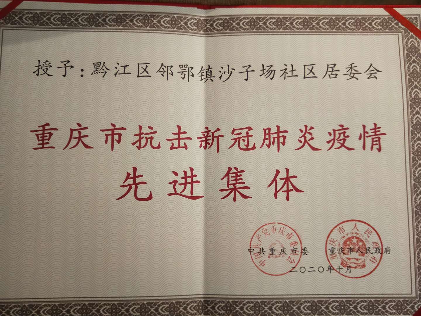 10月19日,市委、市政府召开的重庆市抗击新冠肺炎疫情表彰大会上,黔江区邻鄂镇沙子场社区居委会荣获重庆市抗击新冠肺炎疫情先进集体荣誉称号。
