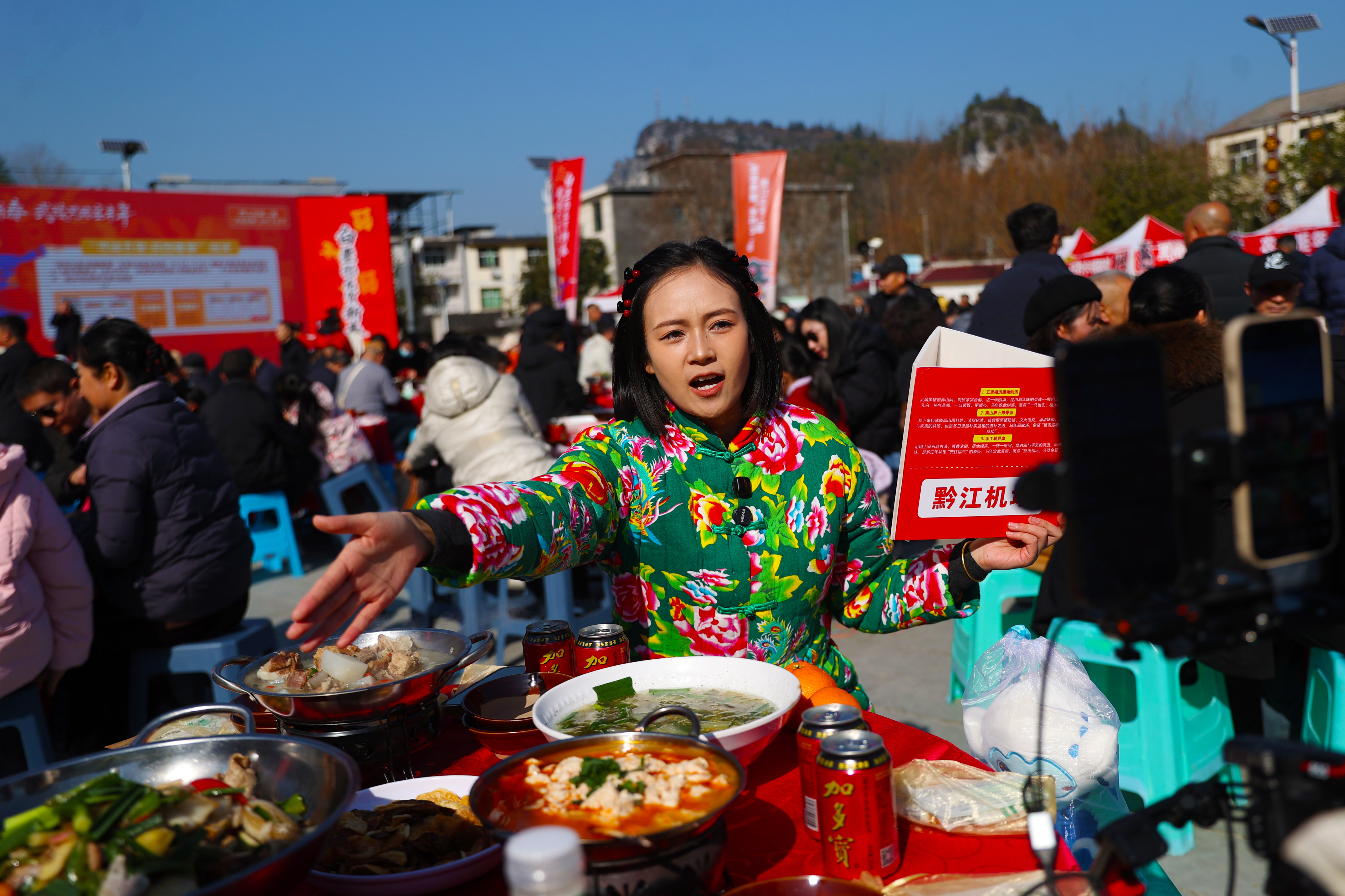 ▲1月11日,黔江区武陵黑猪乡村文化节上,主播在直播武陵黑猪刨汤宴,向外界推介武陵黑猪产品。特约摄影 杨敏