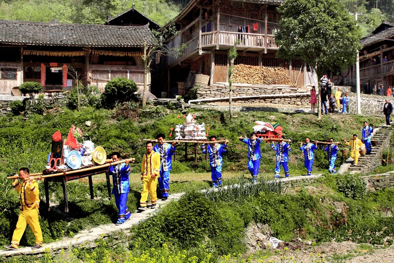 土家族的婚姻,在“改土归流”以前一般是自由择配。未婚青年男女,只要双方互相爱慕,经“梯玛”(土老师)作证,便可以成婚。那时,男女青年在摆手活动中,以唱歌、跳舞、吹奏木叶表白爱情,选择对象,建立感情。经过几年的往来,彼此情投意合,然后在土老师的主持下,举行婚礼。自清“改土归流”后,实行的便是封建包办婚姻,男婚女嫁,全凭父母之命,媒妁之言。嫁娶一般都要经过求亲、订婚、结婚、闹房、回门等程序。土家族婚俗中最具特色的是哭嫁。婚前一月或半月,待嫁姑娘按习俗规矩就要哭嫁,开始是隔一夜哭一次,后来每夜都哭,出嫁前夕要连续哭3至7天,全村寨相好的姐妹和姑嫂、伯娘、婶娘都要来陪哭。其家族亲友都要准备一餐丰盛的菜饭,宴请即将出嫁的姑娘,这叫作“陪嫁饭”。哭嫁的内容十分丰富,有“ 哭父母”、“哭哥嫂”、“哭姐妹”、“哭戴花”、“哭上轿”等。哭嫁的形式,有对哭、群哭、顺哭、间哭,这与其他兄弟民族的哭嫁有较大的区别,是土家族哭嫁仪式的独特之处。结婚头天,为女方的“戴花”日,亲朋挚友都来庆贺,吃“戴花酒”,给新娘梳头戴花。戴花前,要请贤德和有子女的妇女给新娘“开脸”,即绞去脸上的汗毛,修好眉毛,并将长发辫子绾成“粑粑髻”,缠上红头绳,插上各种头饰。接着,举行隆重的戴花仪式,新娘要以哭答谢前来给其戴花的亲戚。有文人墨客的竹枝词写道:“新梳高髻学簪花,娇泪盈盈洒碧纱。阿母今朝陪远客,当筵十个女儿家。” 描写的便是土家族的哭嫁婚俗。