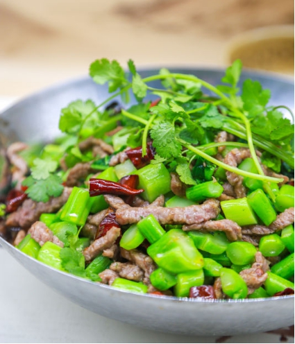 在黔江的大小餐馆中,青菜牛肉多以“煨锅”的形式制作。先将青菜入锅炒至七八分熟盛出,再在锅中倒油并滑入牛肉炒至七分熟后沥油捞出,底油中下干辣椒等配料炝香,最后倒入牛肉、青菜,并加入各种调料快速翻炒均匀就可以,盛放用铁制或不锈钢制的小锅,上桌后继续加热,食客可以慢慢边煨边吃。