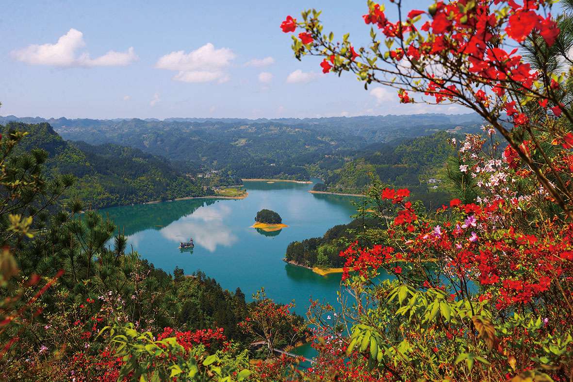 黔江区小南海是一个融山、湖、岛、峡诸风光于一体的高山淡水堰塞湖泊,是国内迄今保存较完整的一处古地震遗址,也是国家地质公园。时下,湖边的映山红竞相开放,把堰塞湖、公路、民居、山峦掩映成湖光山色的风景画,美不胜收。图为记者近日拍摄的小南海一角。首席记者 杨敏 摄