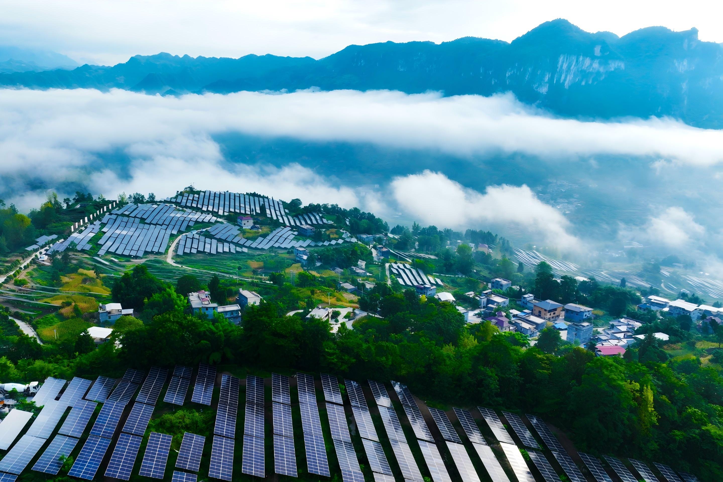 近日,云雾掩映着位于黔江区中塘镇的中塘光伏发电项目,日前,该项目总装机容量70兆瓦(一期)顺利并网发电。至此,黔江区光伏装机容量突破22.8万千瓦,最多可以满足6.4万户家庭的日常用电。近年来,重庆市黔江区坚持生态优先,走绿色低碳发展之路,充分依托良好的山区“风”“光”资源,打造生态清洁能源,先后建起五福岭风电场、麒麟盖风电场和麒麟盖光伏发电站、中塘光伏发电站,构建起以新能源为主体的新型电力系统,为乡村振兴注入新能源。