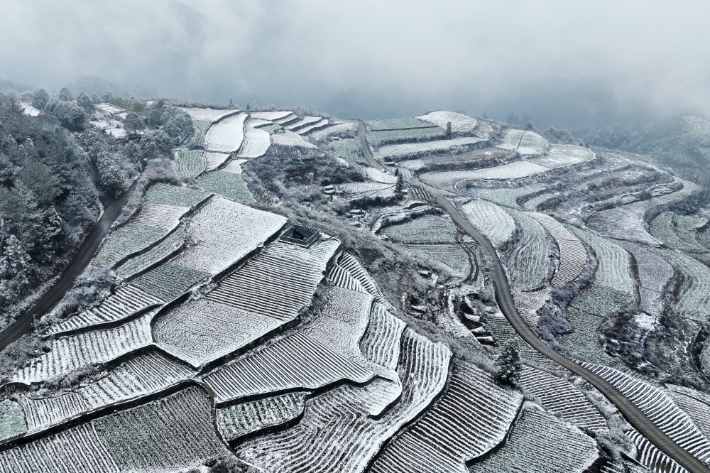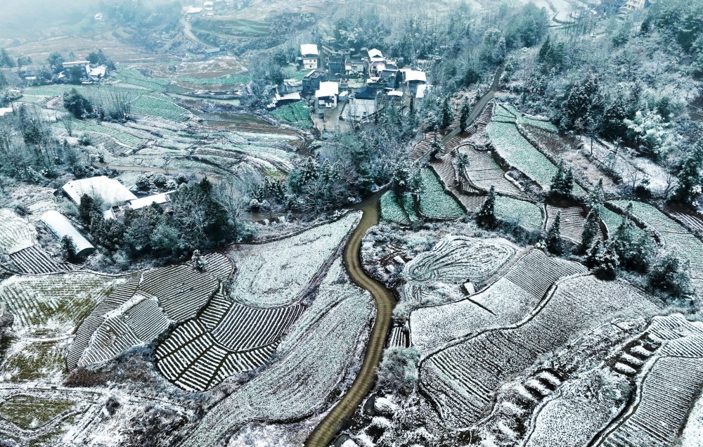 2月13日,春雪覆盖着黔江区邻鄂镇高坪村的田园和民居。特约摄影杨敏