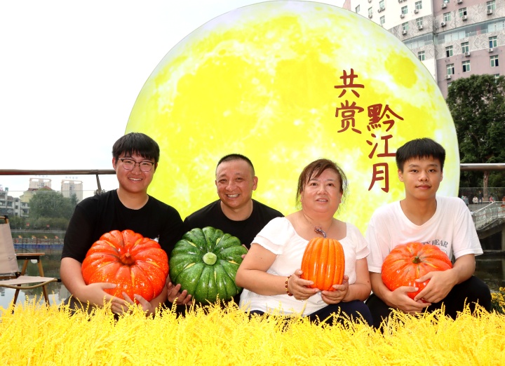 游客抱着“大南瓜”共赏黔江月