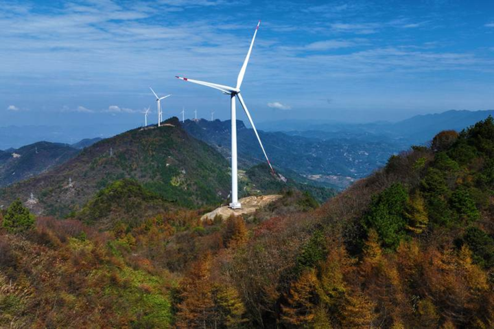 初冬时节,黔江区五福岭风电场彩叶林层林尽染,与坐落在山上的风电塔交相辉映,美如画卷。