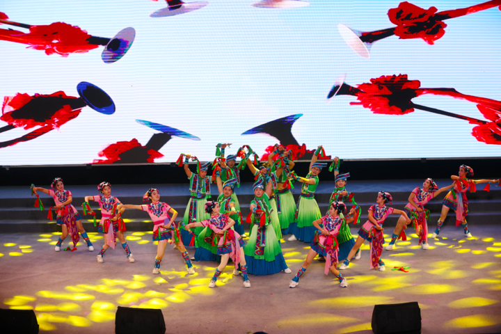 黔江区演职人员在武陵水岸表演苗族铜铃舞《太阳出来咯》