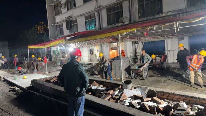 原计划逐步推进改造的施工方案,调整为分5个段全线同步开工。近千名施工作业人员实行“两班倒”,机器不停、脚步不歇。区城市管理局领导班子成员分段包干,全天候驻守现场,问题不过夜,协调不掉线。挖掘机、渣土车、混凝土罐车昼夜穿梭,发电机的轰鸣声从清晨撕到深夜。区城市管理局现场负责人声音沙哑,但语气坚定:“为了让群众早一天享受成果,我们没有退路,只能往前冲,这既是效率,更是态度,我们坚持把白天当战场,晚上当白天,通过这种拼劲和韧劲,把‘不可能’变成‘可能’。”