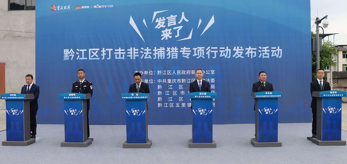 在新闻发布会现场,区委政法委新闻发言人发布黔江区打击非法捕猎专项行动推进情况,区公安局、区市场监管局、区林业局、五里镇等单位新闻发言人结合各自职能职责介绍打击非法捕猎专项行动有关情况,各发布单位新闻发言人回答记者和村民提问。
